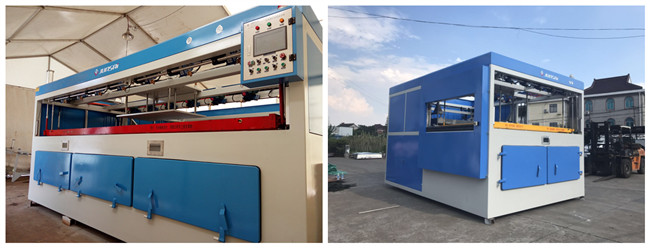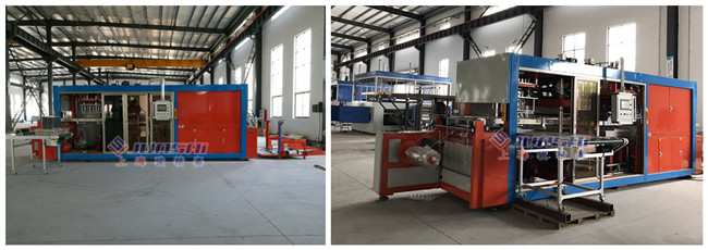 2.    ACF系列大高速吸塑機(jī)。是市場上使用吸塑機(jī)型號,在自動化程度、產(chǎn)量、人工使用量、機(jī)器價(jià)格親民,較為容易接受的吸塑機(jī)設(shè)備。工藝步驟:卷材自動拉料、加熱、真空吸塑整版裁切、裁斷機(jī)分切。