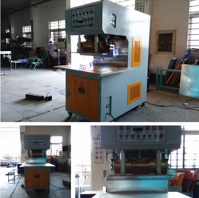 由圖片可看出操作平臺此同其設備視覺效果好,調(diào)節(jié)模具更方便,增加了U型槽的寬度及深度,并在U型槽兩側(cè)加裝了滾輪,對鎖模壓板的瘦身擴大焊接部分的操作空間,感應板的設計可方便地幫助用戶將膜材定位,高頻輸出銅片通過鋁板固定使其始終保持在高位,避免操作中較多材料被銅片劃傷現(xiàn)象,在控制部分加裝專用試模按鈕幫助操作員非常方便地對位,壓料及調(diào)試時的二次焊接,客戶通過與同其設備比較后反饋,這款設備操作更靈活了,對位方便了,拉大面積材料省力了,員工不會燙到手了,效率提高了。