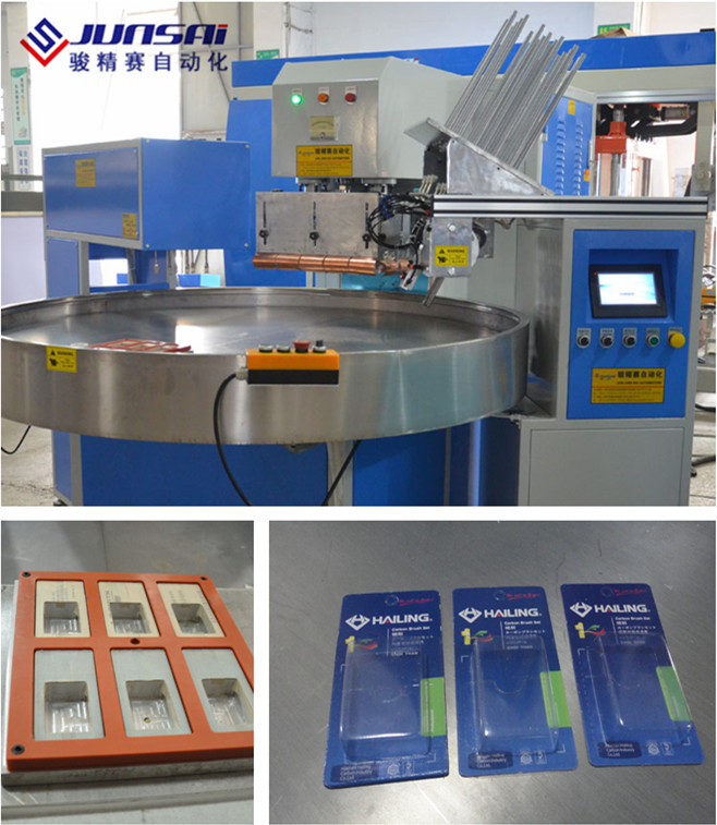 上海駿精賽機(jī)械手六工位吸塑包裝機(jī)。該設(shè)備適用于紙卡泡殼焊接、雙泡殼熱合切邊、汽車內(nèi)飾用品熔接、文具用品包裝熱合、雨具無縫焊接、鞋類制品壓花、冰袋熱合熔接以及各種包裝品的焊制。
